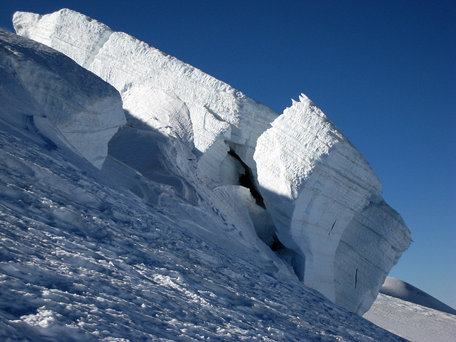As we descended the Dome du Gouter, we saw this very interesting situation we had traversed under in the dark, and wondered how many more hours until it topples? We scooted under this baby as fast as we could. |