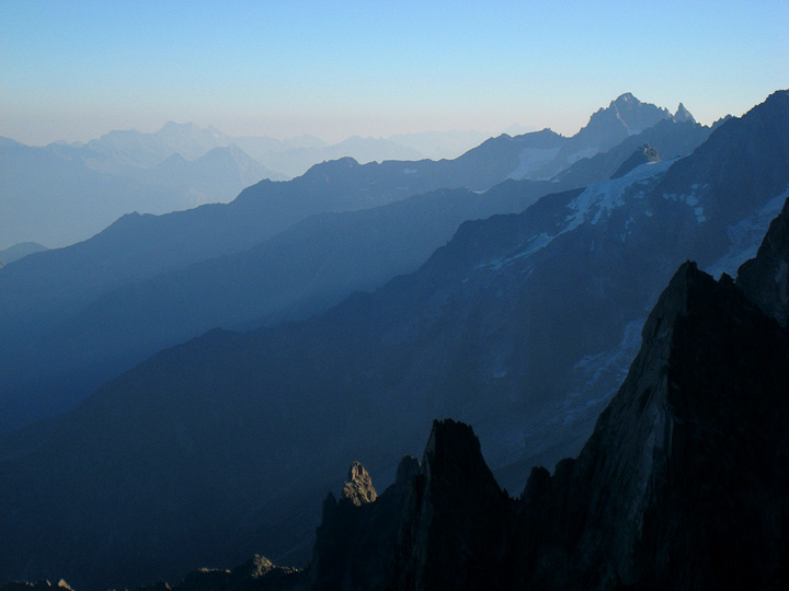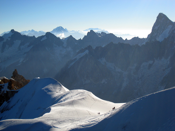 On the summit of the Point Lachenal, looking back towards the Aiguille du Midi. Making good use of the lift, they were back in the valley for the evening. |