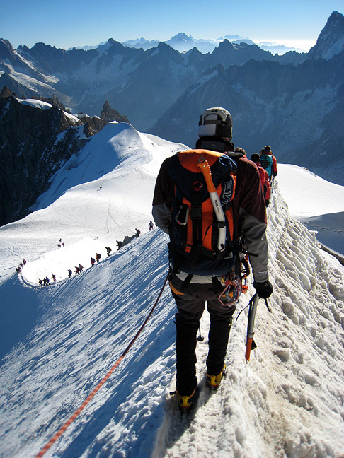 Stepping out onto the sharp arête as we exit the tunnels of the Aiguille du Midi. |