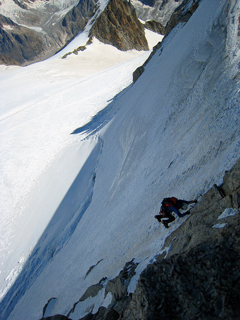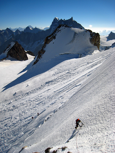Unfortunately, I don't have any photos of the steeper parts of the route. Here Ted walks up the snow-covered ice near the top of the climb. After tagging the summit of the Tacul, we head down, spending the night at the Cosmiques hut. |