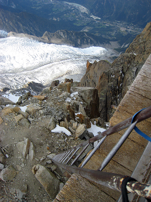 There was a photo shoot happening on the last part of the Cosmiques. These attractive young climbers will appear in some clothing catalog in the not too distant future. They would come back to the "ladder pitch" change outfits and then go back to the rocks here for more "action". I don't think Ted and Mark will make the cut, however. |