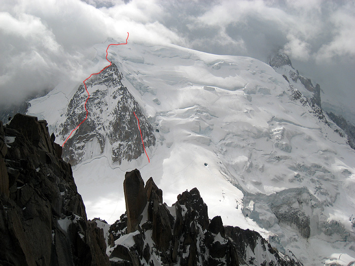 This photo was taken as we are about to head down the cable car in worsening weather. I have marked the Contamine-Grisolle route on the left and the Chèré Couloir on the right. |