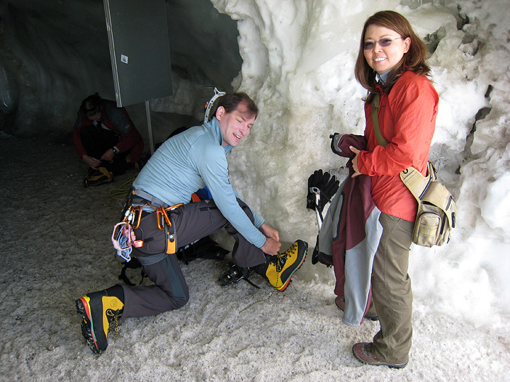 Ted and Phyllis on the morning of the first day, at the top of the Aiguille du Midi, as Ted gears up to head out onto the ice. |