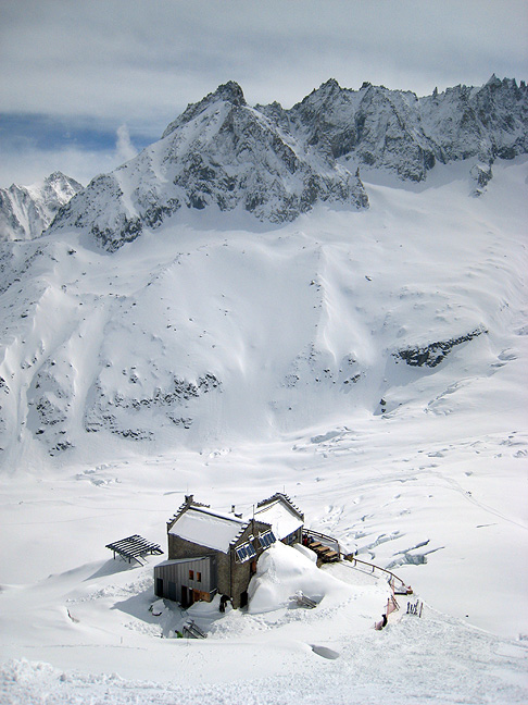 We pause for a lunch break at the Requin hut. Great skiing conditions for us, but after weeks of heavy snowfalls every couple of days, the hut keepers are getting tired of digging out and shoveling acres of snow every morning! |