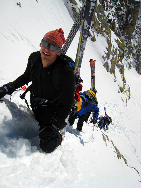 Descending the back side on a rope is always exciting. Once tested, the deep and heavy snow proved stable, but made for an arduous side slip. |