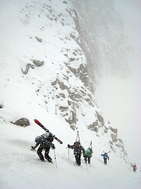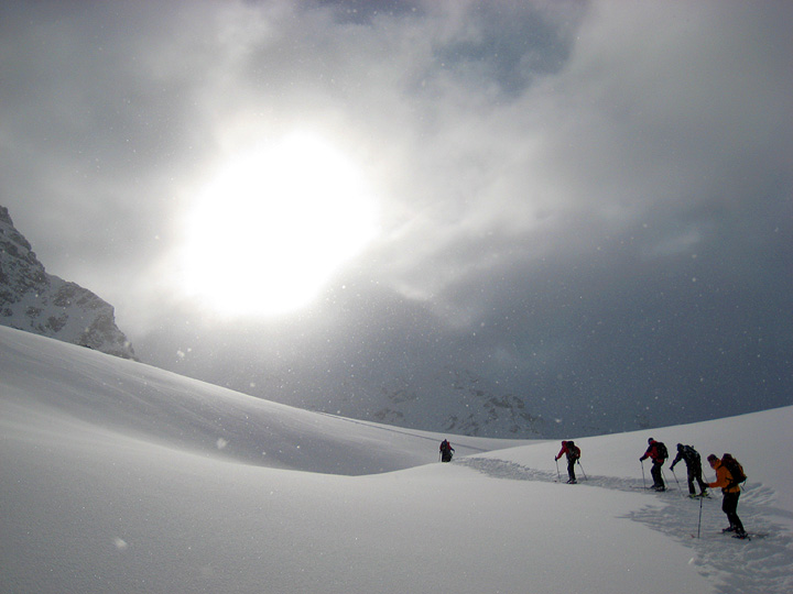 Less lucky the following morning, we boot up the short climb to the Col des Ecandies in a blizzard. |