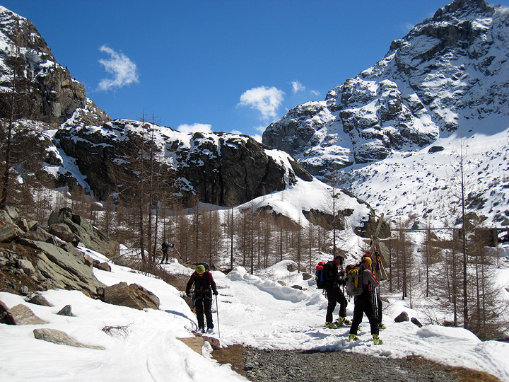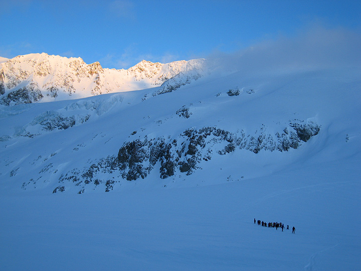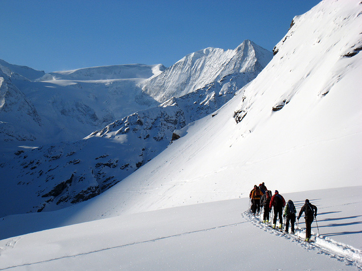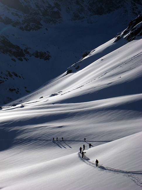 On day 4, leaving the Montfort hut, all the recent snowfalls pay off as we wander in a powdery wonderland up toward the Rosa Blanche. |