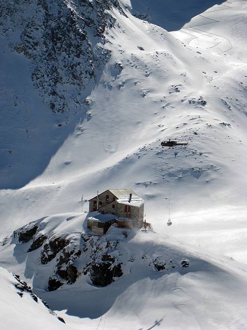 We approach the Dix hut from above, just in time to watch our rösti being delivered by helicopter (or so we liked to think). |