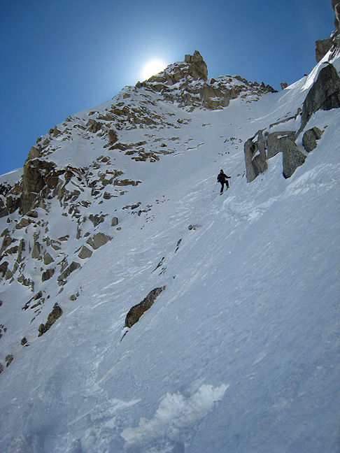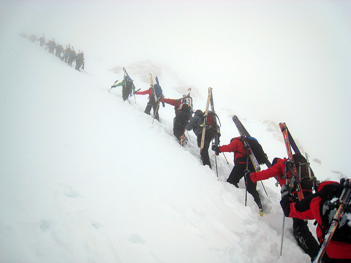 On day 5, we approach the "Serpentine". This often-icy slope was beautifully packed with perfect snow this year, allowing us to skin up it without having to resort to boot crampons, a rare treat. |