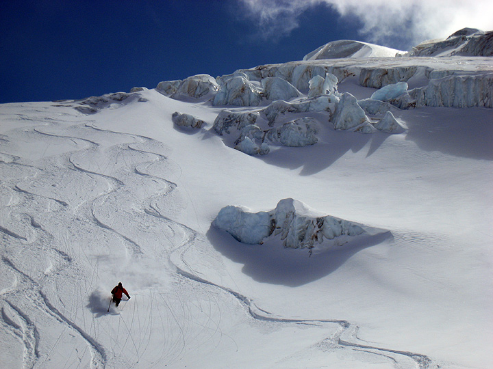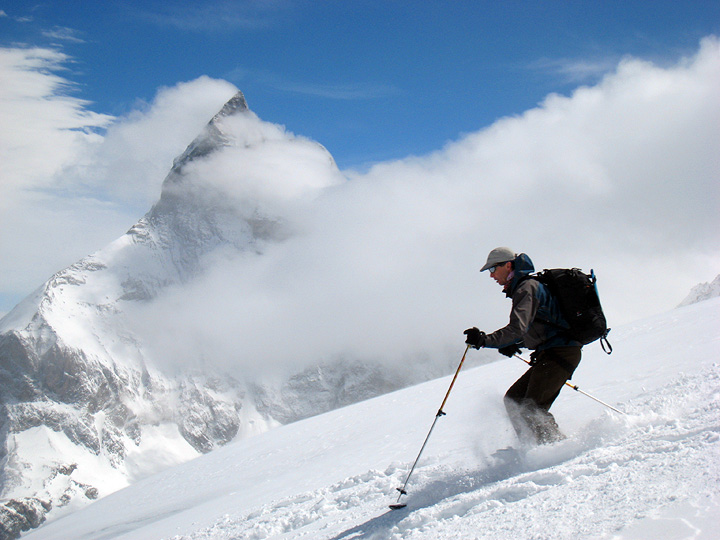 The snow gods were kind as well, as we enjoyed a fluffy ride down the Stockji Glacier toward Zermatt. |