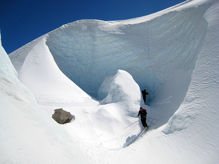 But the really fun part is the watercourse labyrinth, safely dry and snow-covered at this time of year, as we glide down the lower reaches of the Gorner Glacer. |