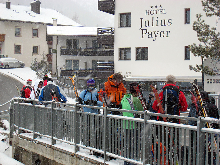 Our crew awaits the ski bus outside our hotel in Sülden. Alan and Carol Agle took time away from their own incredible snowpack in the Wasatch, to join us here in the South Tyrol. The rest of the crew had come with us directly from the Stubai: Elizabeth Moceri, Tom Drake, Chris Robinson, Marc Gallie, and Rich Davis. |