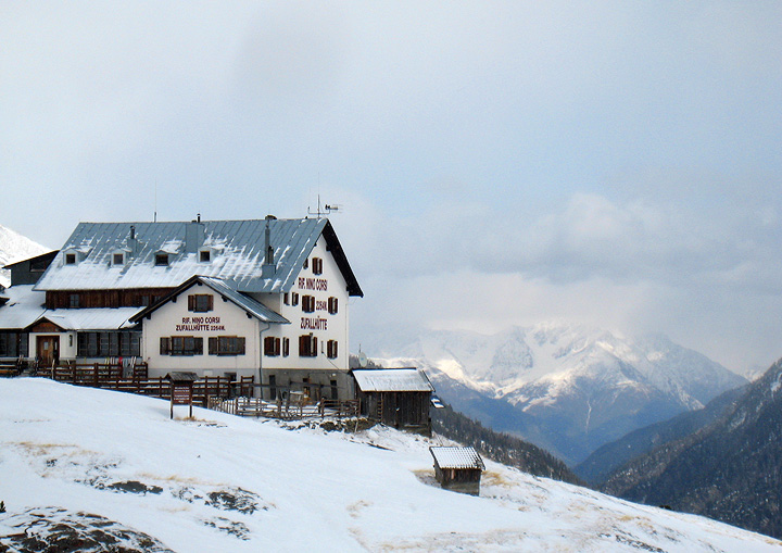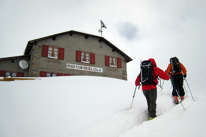 Heavy trail-breaking but lovely silent snowfall as we make our way to the Pizzini hut, arriving in time for lunch. |