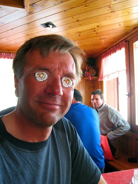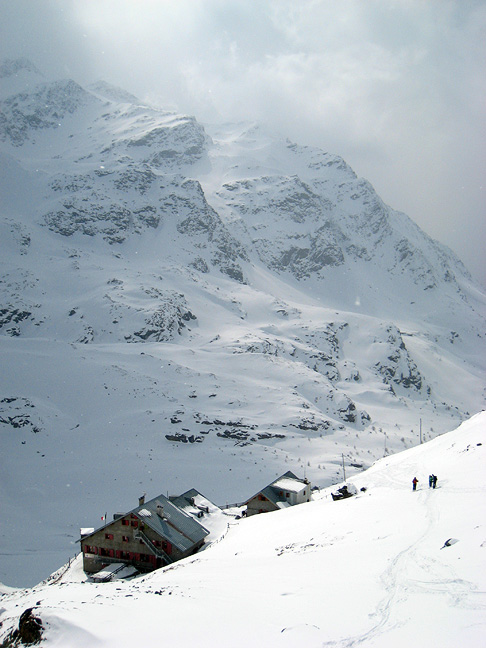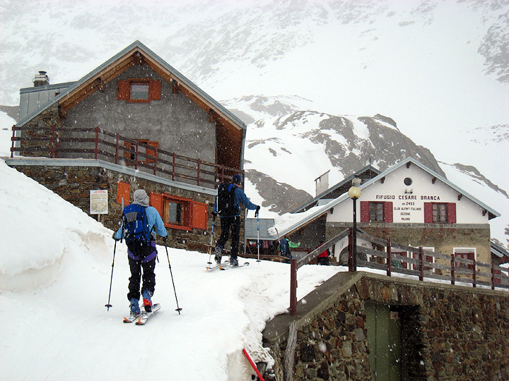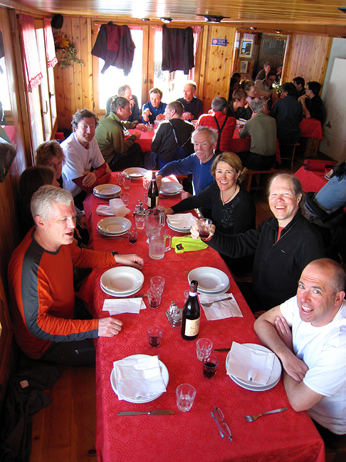 We had a great ski down, in very good snow for the most part, but very poor visibility. Here we return to the safety and comfort of our home away from home, happy to have a hot shower and a capuccino to look forward to. |