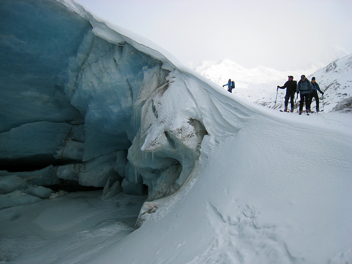 Early on our next morning's jaunt, we stop to admire an ice grotto at the toe of the Forni glacier. |