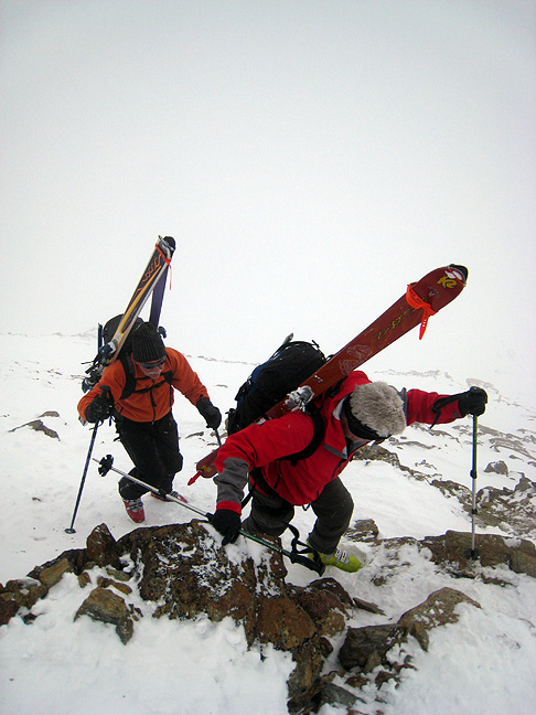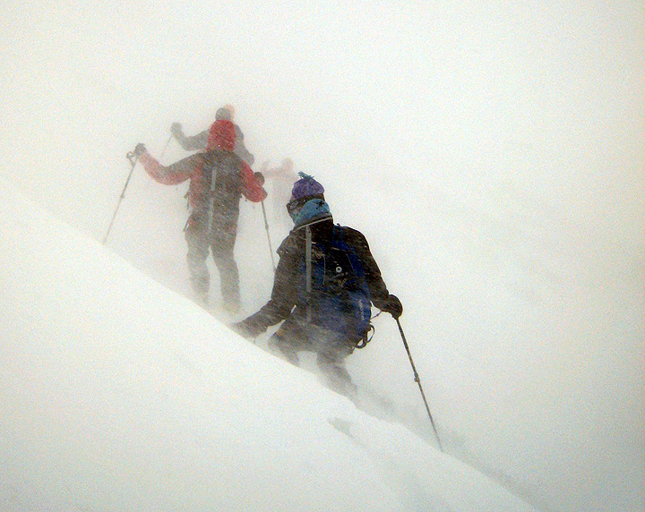 The next morning it's back to the fog/wind/snow storms as we boot up the steep upper slopes toward the Casatti hut. We had intended to stay another night at the Pizzini, but the weather forecast was for even worse weather on our last, exit day, so we decided to skoot while we could, get back to Sülden, and then do a day trip for our last day, so as not to find ourselves stuck on the wrong side of the mountains. |