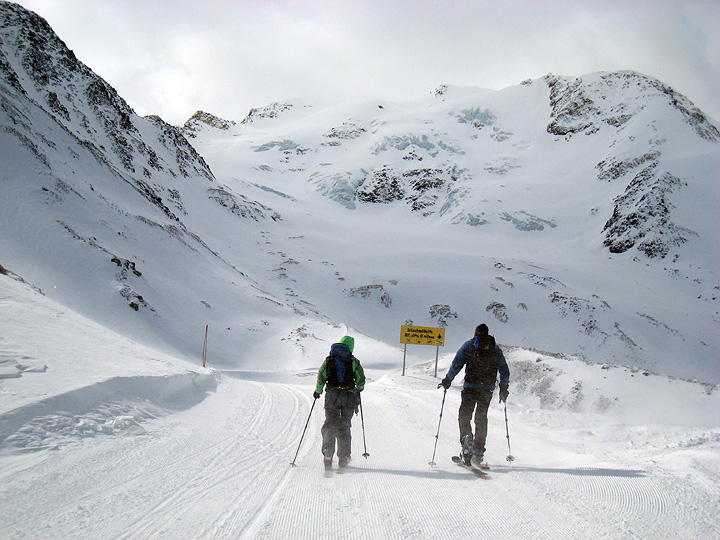 Later the same morning, a strong cold wind swept the ridgecrest as we left the ski area and started down the Madritschtall. Fortunately the wind speed slacked off immediately as we dropped below the high point of the ridge. |