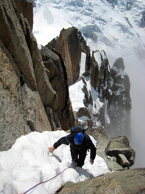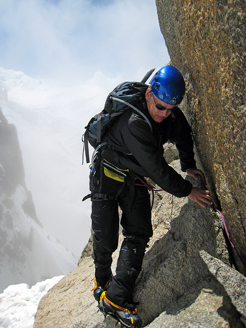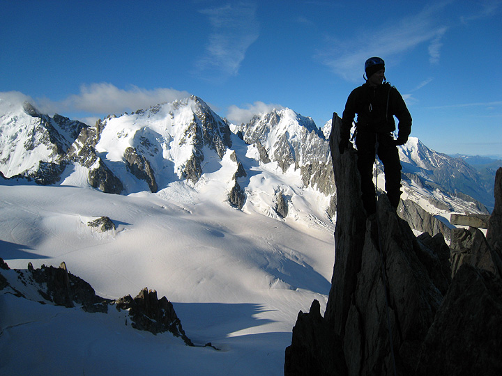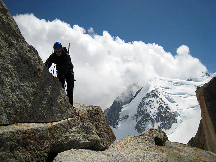 Climbing on the Arete with Mont Blanc du Tacul behind. |