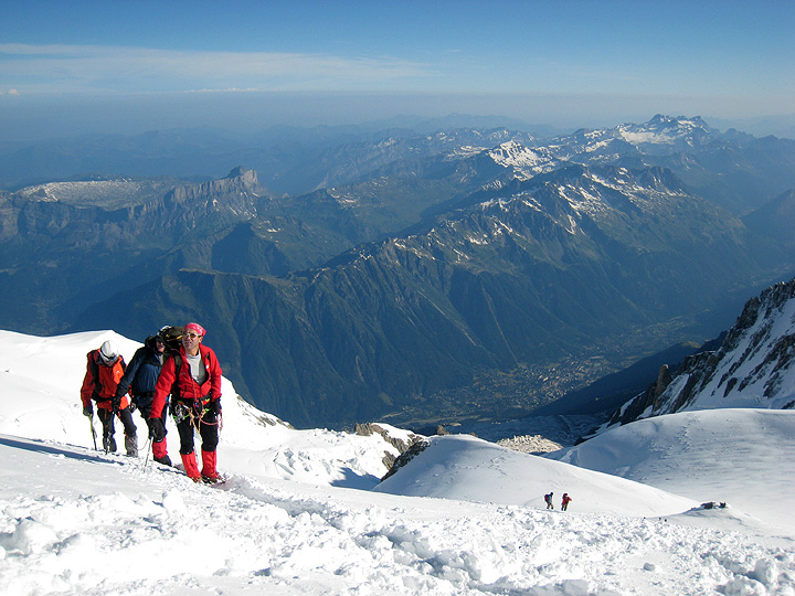 After another night in the Cosmiques hut, we continued on to Mont Blanc via the Traverse. Here, we are at the Col de la Brenva, at sunrise. |