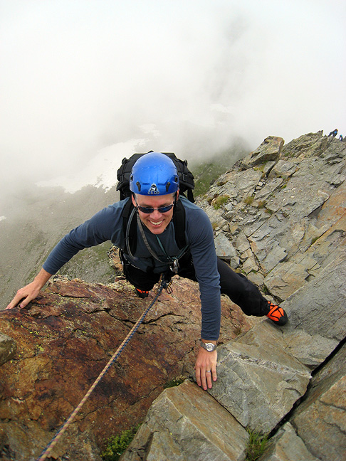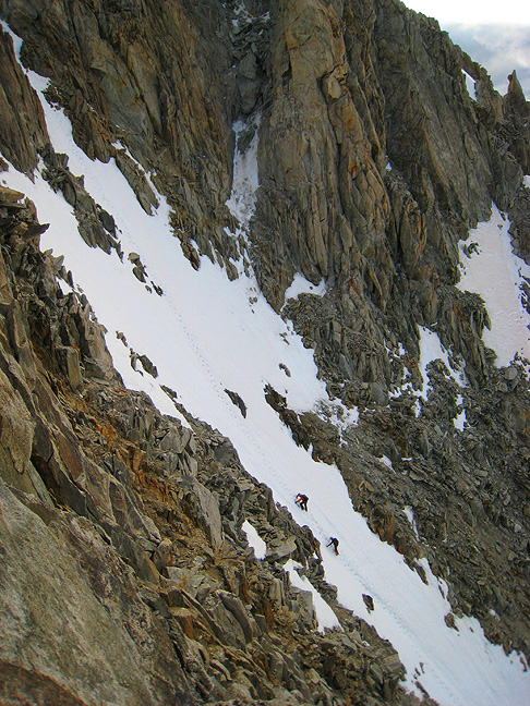 Looking up towards the summit of the Midi. Only a few pitches remain to the end of the route. |