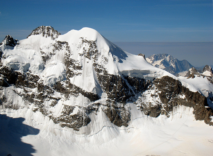Piz Roseg as seen from part way down Morteratsch. The normal route from the Tschierva hut, climbs close to the right-hand skyline. The true summit is the rocky peak on the left, being a few meters higher than the snow dome. |