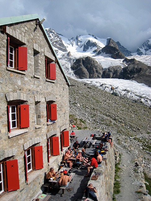 We descended Morteratsch via the rout eon the west side, easy, though a long way down. The comfortable Tschierva hut was our home for the following two nights. Piz Roseg can be seen behind, the next day's objective. |