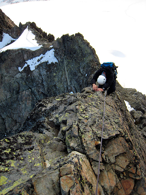 Looking back down on the last rocky tower. Morteratsch is the peak behind, on the right. |