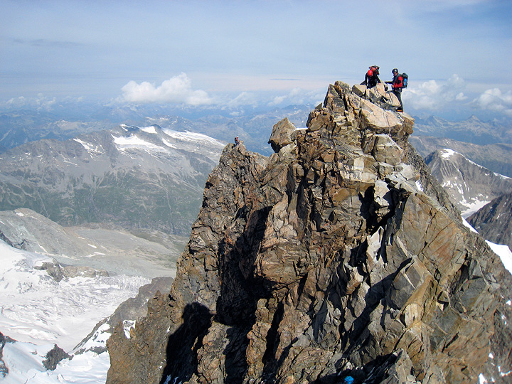 Climbers on the final tower. From here, they will descend about 20 meters, traverse a small notch and climb the last 100, or so meters to the summit of Piz Bernina. |