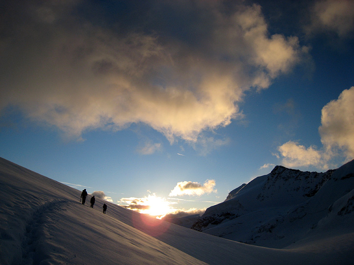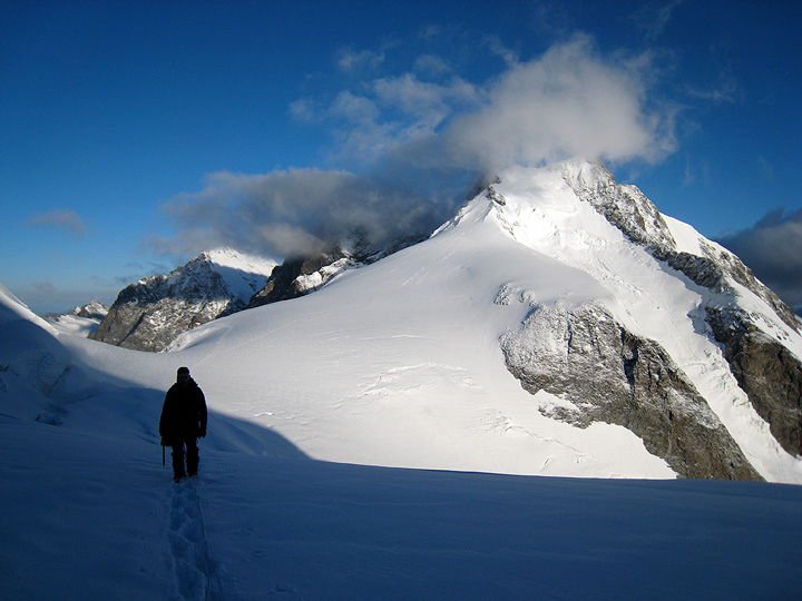 New snow and climbers, heading up the normal route on Piz Bernina. |