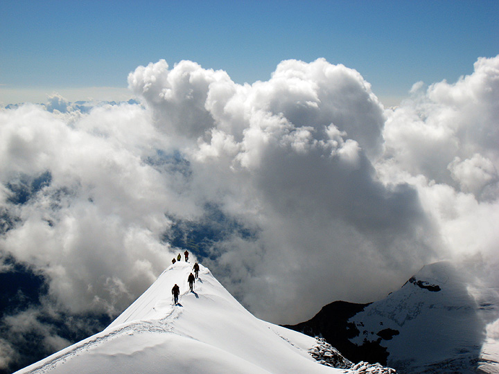 Another party at the very top of the snow ridge, where the route turns to rock. |
