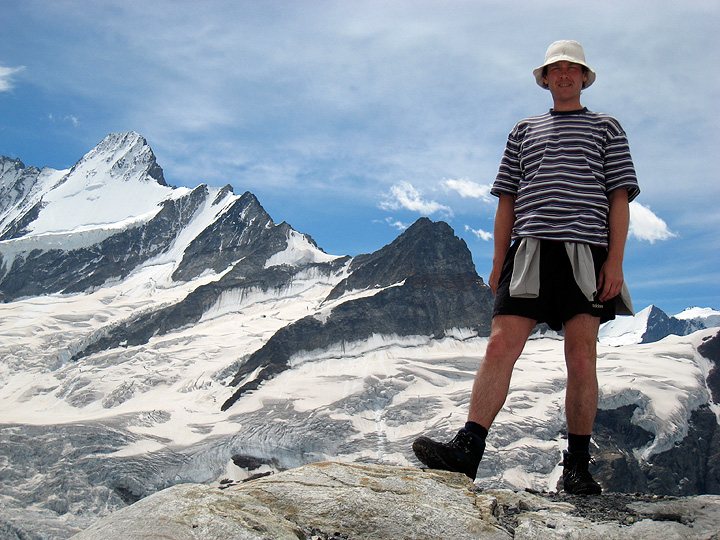 David and the Schreckhorn. This shot was taken from a wander up above the hut to a fine viewpoint. |