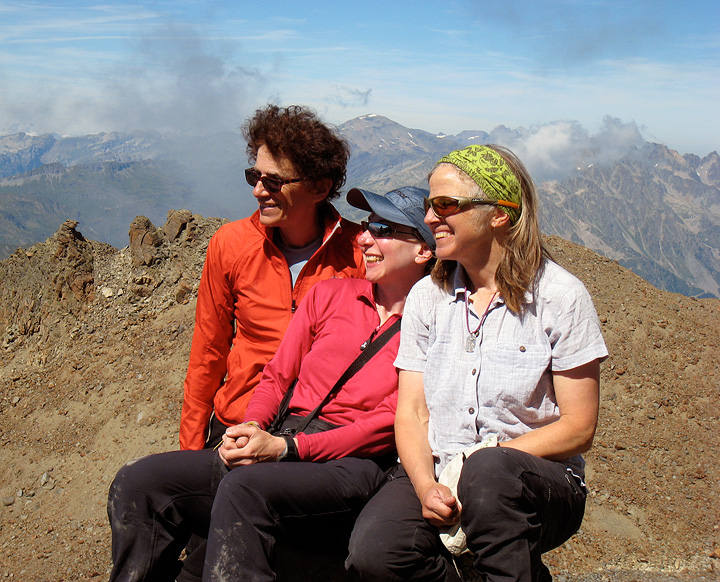 Sandy (in back in this photo) has climbed with Kathy before, both in the Alps and with the "Chicks" in Ouray, but this was the first time Kathy had climbed with her friend Gini. Here our first day ends in sunshine on the Aiguille de Toule. |