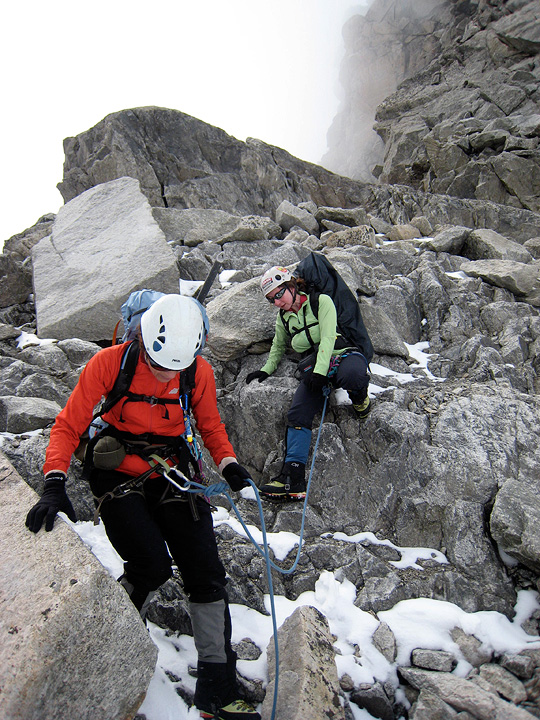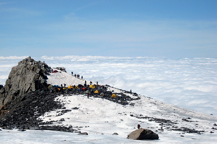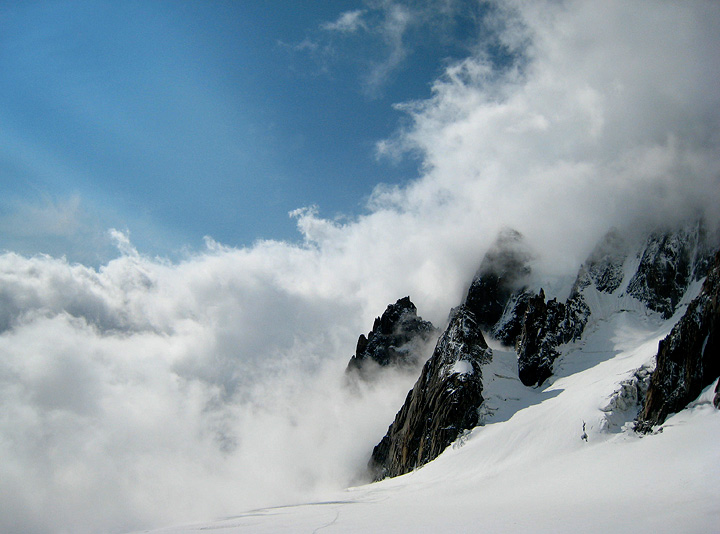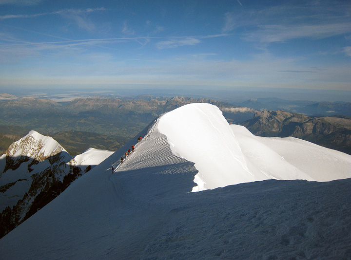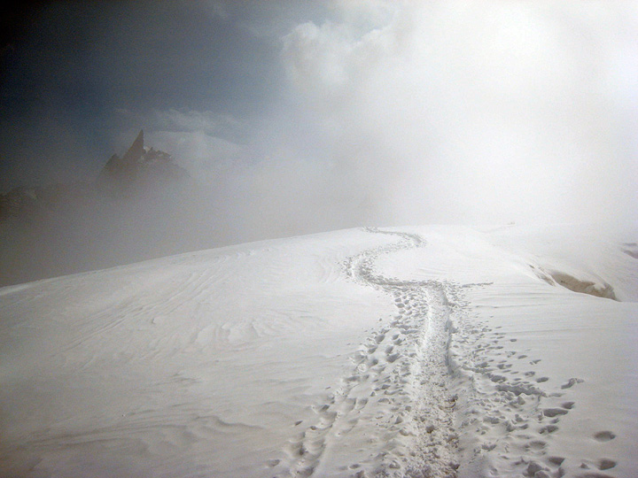 Climbers returning back the ridge line. This Spring was very stormy and snowy, and this summer has also been cool in general, with frequent snowfalls up high. Compare the state of this famous snow feature, with its state in 2005, shown in the next picture.... |