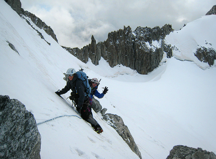 The same recent snowfall and cold temperatures actually helped make the Grand Couloir both less risky than normal on this cold day, and certainly less ugly! |