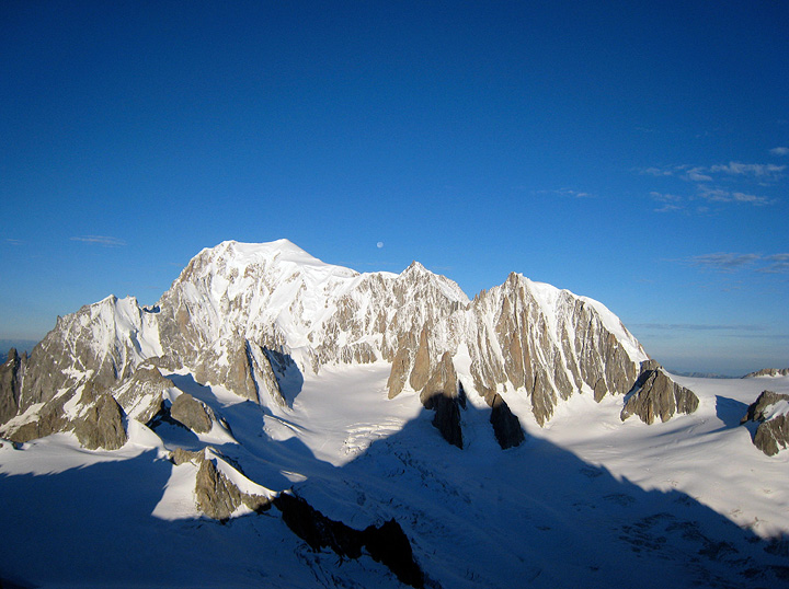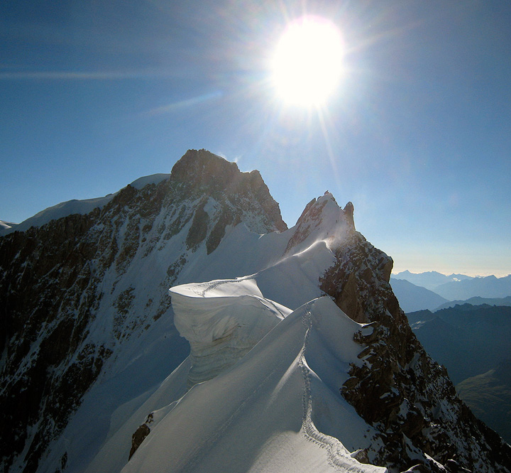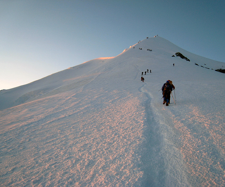 A flawlessly clear sky brightens over Mont Blanc behind us as we climb. |