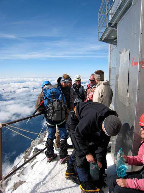 It began in freezing fog. Here we "re-combobulate" after descending the exit ridge out of the Aiguille du Midi telepherique top station. |