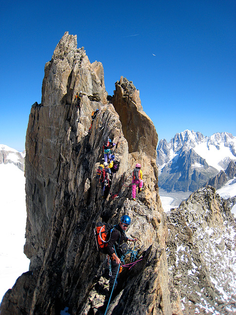 The previous day's weather had been a bit on the moist side with new snow on many of the higher summits. For better or for worse, this tended to concentrate the crowds on those summits that would still be feasible. A busy day on the Entreves. |