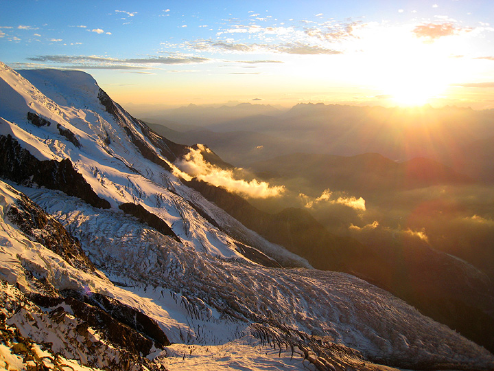Looking to gain acclimatization points, we spent the night in the Cosmiques hut. A lovely sunset this evening. |