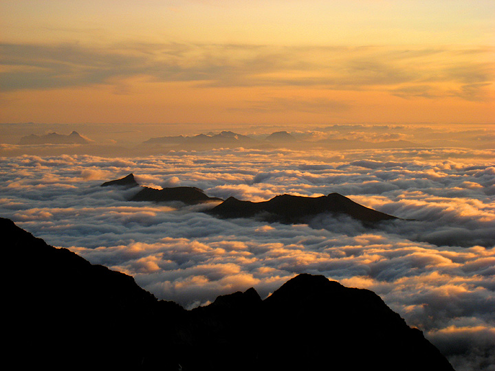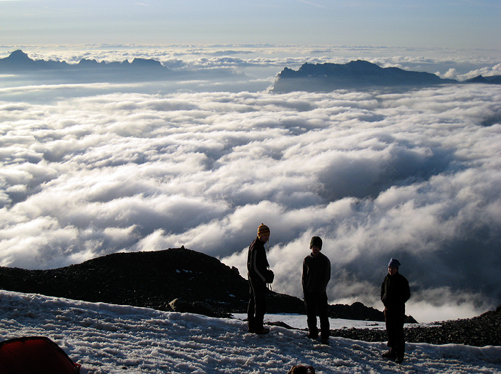 Climbers enjoying the view over a sea of cloud from near the Tete Rousse hut. |