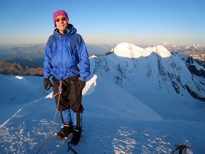 On the summit of the Riffelhorn with Monte Rosa behind. |