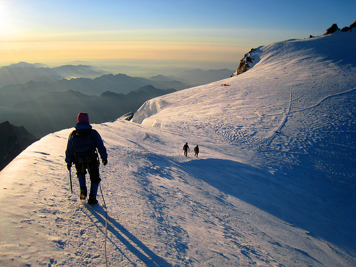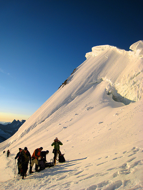 The sun comes up as we climb the last slopes to the west summit of the Liskamm. |