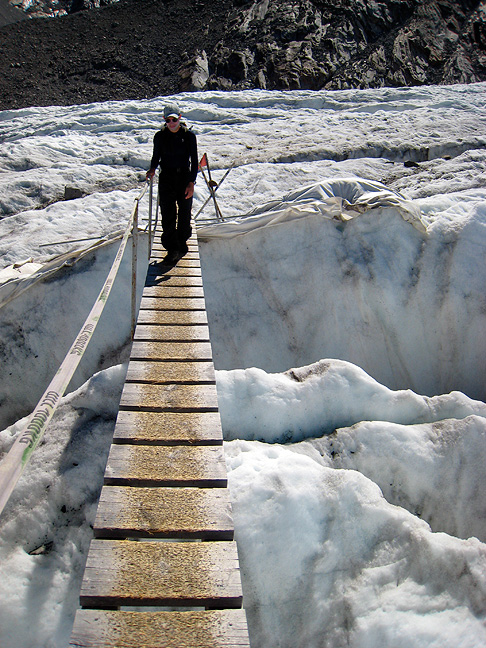 Lower, on the Grenz Glacier, a bridge crosses a chasm. |