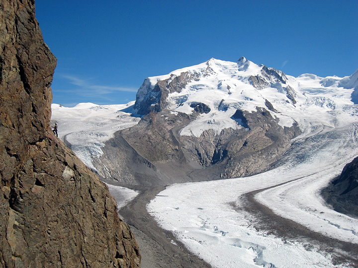 Looking across the Riffelhorn's South Face to climbers another route and Monte Rosa behind. |
