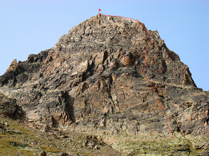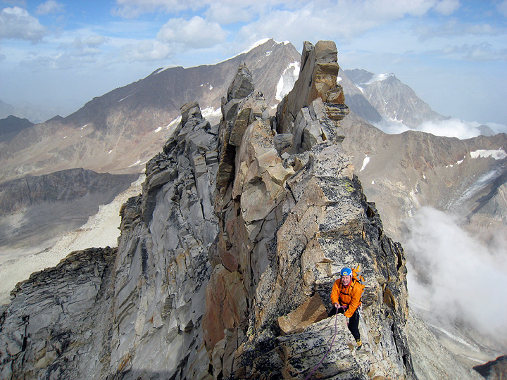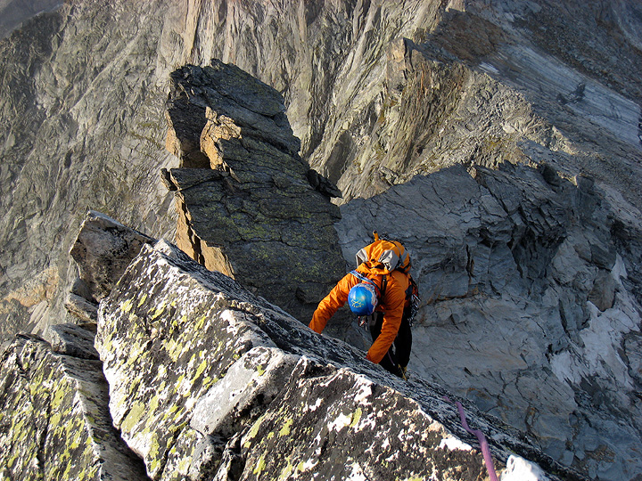 Here, we have just traversed past the summit and are threading our way through the towers behind towards the easier descent route to the north. The Weissmies is the big peak behind. In the end we did manage to get all the way down to the hut and partway down the trail to the car before the rain arrived. |