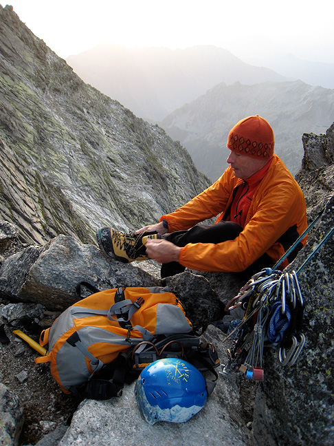The following day, in rain, we hiked up to the Almageller hut. Our goal was to complete a traverse of the Portjengrat, a big rocky peak, the day after our hut hike. Here, in remarkably hazy weather Emery tightens his boots in preparation for the technical climbing to come. |