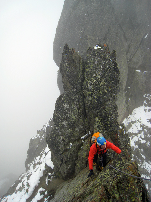 Unfortunately, a day and a half of truly nasty weather prevented us from soon getting back into the hills. However, after a wee break we did venture out, enjoying a slightly soggy day on the traverse of the Aiguille Crochues, a fun peak in the Aiguilles Rouges above Chamonix. Views were rather limited. |