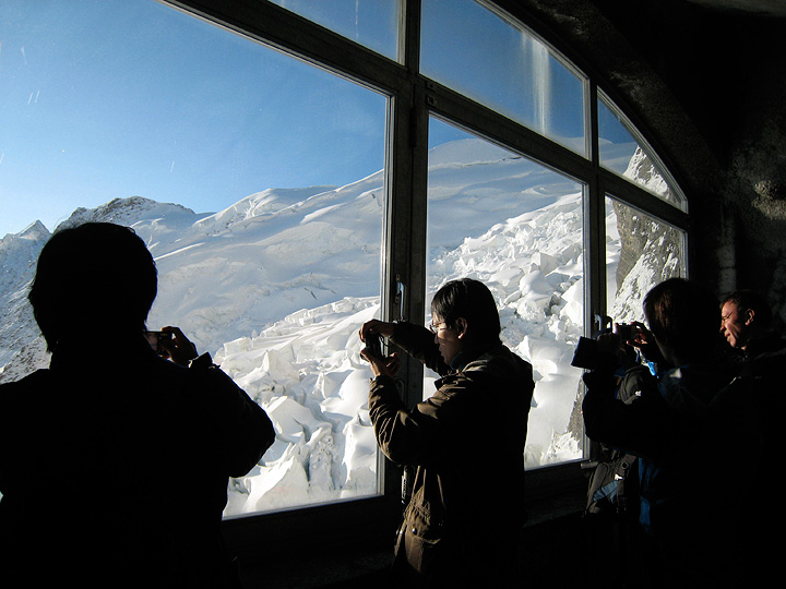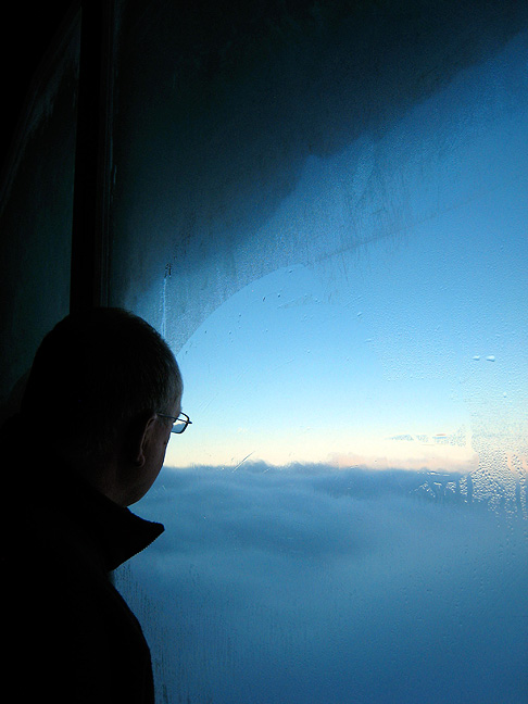 Discouraging fog dropped away below us as we rode the Jungfraujoch train up through the bowels of the Eiger. Peter looks out at the sea of clouds from the Eiger Nordwand windows. |