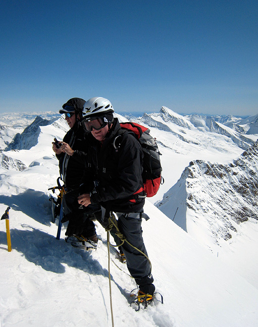 Mark enjoys a brief pause for a photo opportunity on the Mönch's Southeast Ridge. |