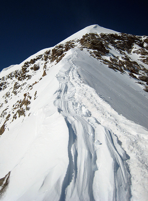 We paused again for "summit" photos, at our high point on the summit ridge. The long traverse to the top from here necessitates traveling on the steep flank just off the crest of the very corniced ridge, which in these conditions was too exposed to a slab taking off down the south face. We did not have the time to secure this section as it would have required, so we called it good and returned to town. It was a good effort on a beautiful day, with very little company on this otherwise popular route! |