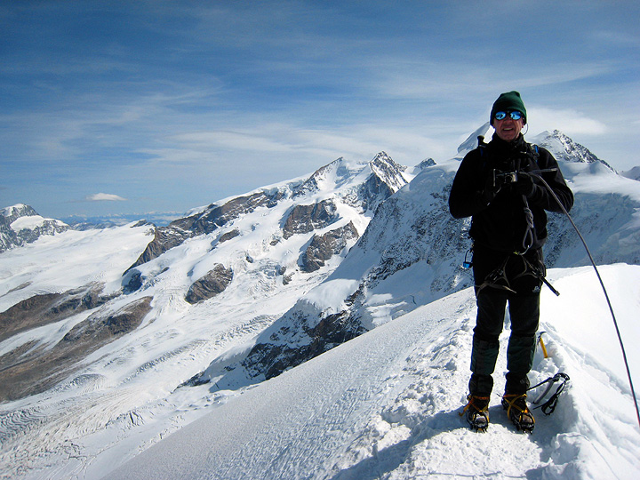 Mark enjoys some more photo opportunties from the top, with Lyskamm and Monte Rosa in the background. |